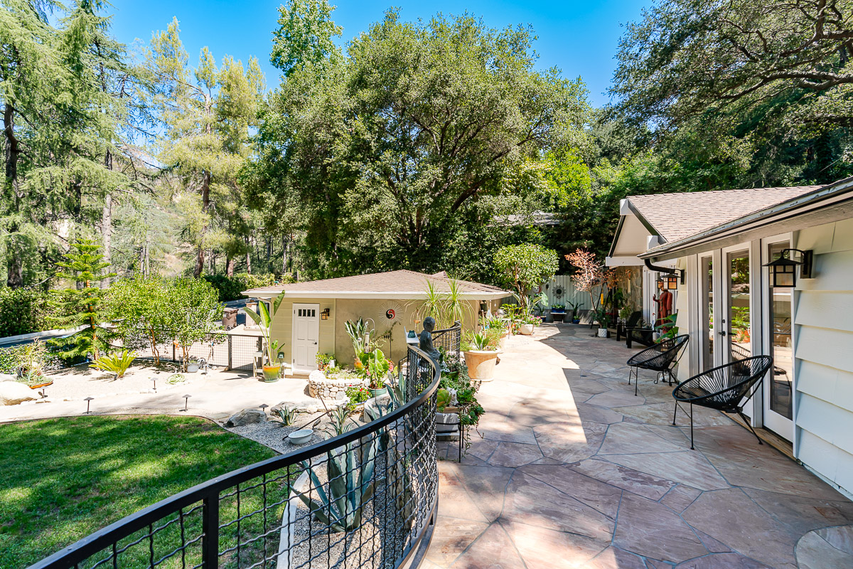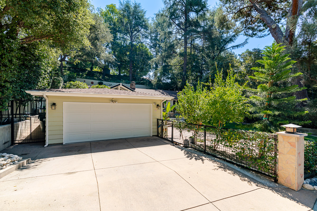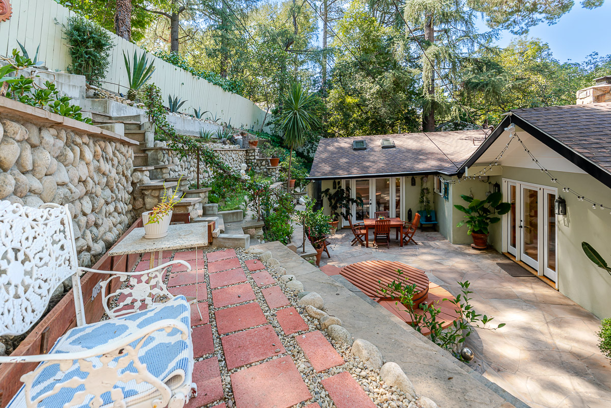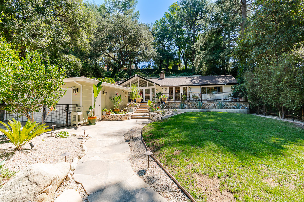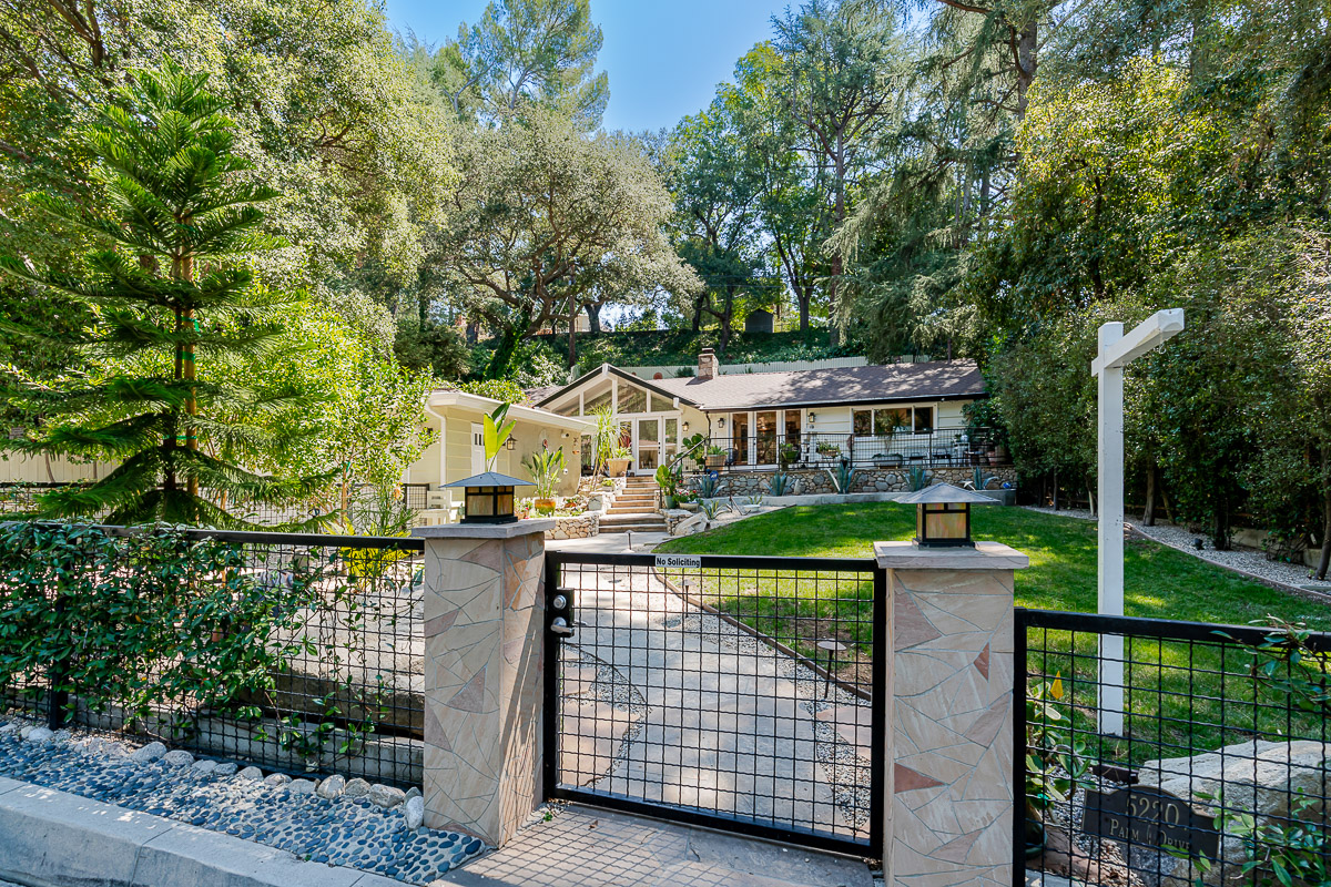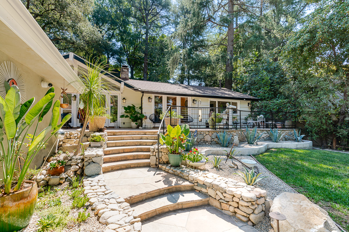 Welcome to 5220 Palm Drive, a beautiful Ranch-style home with Mid-Century influences, nestled in the serene hills above La Cañada Flintridge. Built in 1955, this thoughtfully designed residence offers 3 bedrooms, 2 bathrooms, and 1,656 square feet of light-filled living space on a private 8,361 square foot lot. A winding pathway leads to a spacious flagstone patio, ideal for alfresco dining and entertaining. Inside, the fabulous floor plan features vaulted ceilings, skylights, hardwood floors, and abundant storage throughout. The living room and primary suite both open through French doors to a tranquil rear patio with a built-in hot tub, creating a seamless indoor-outdoor flow. The primary suite is a true retreat, complete with a large walk-in closet, claw foot soaking tub, and oversized shower. The chef’s kitchen is equipped with custom Alder cabinets, stainless steel appliances, a double oven, double dishwasher, farm sink, and a large island with prep sink—perfect for everyday living and entertaining. Outdoors, the beautifully landscaped grounds showcase mature trees and vibrant plantings, including two lemon trees, a Fuji apple tree, a Key lime tree, and a pomegranate tree. This lush setting provides an inviting backdrop for gatherings or peaceful relaxation. Additional highlights include a detached garage, expansive patios, and a setting that offers both privacy and serenity—an ideal retreat in one of La Cañada’s most desirable neighborhoods.