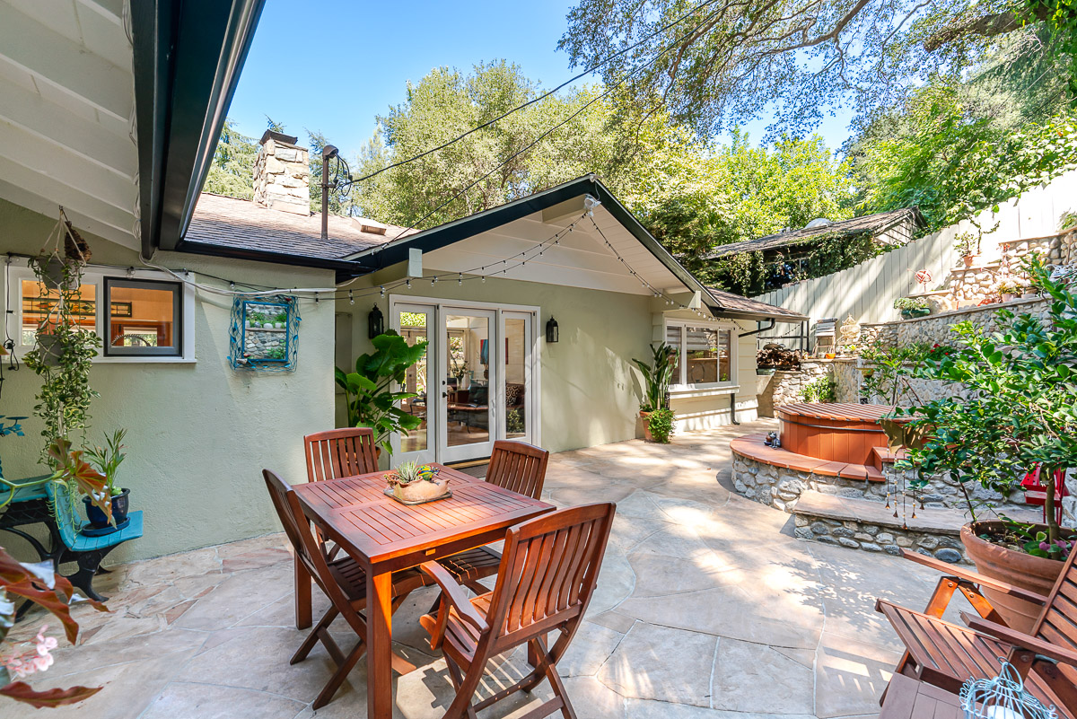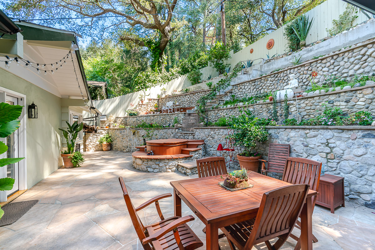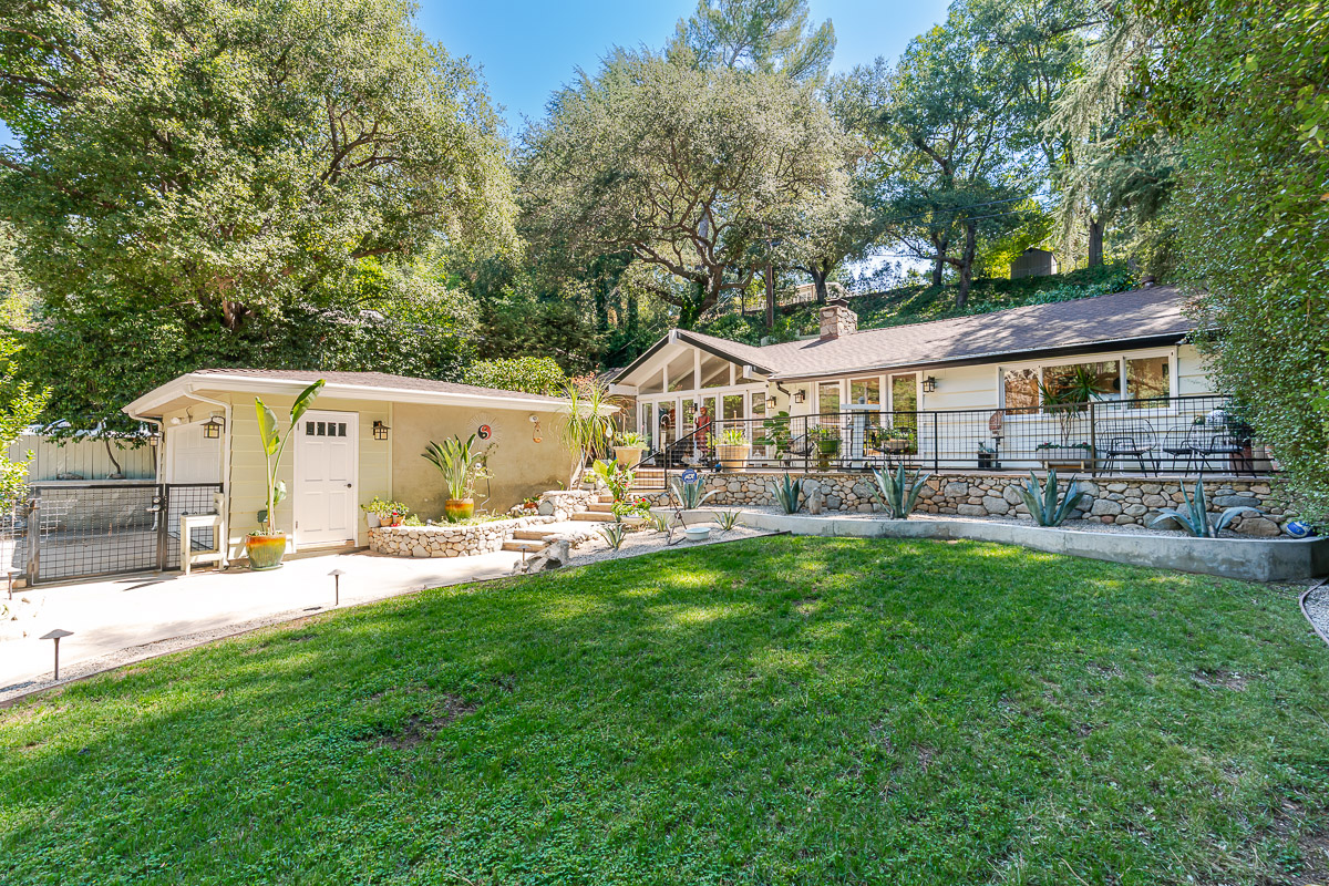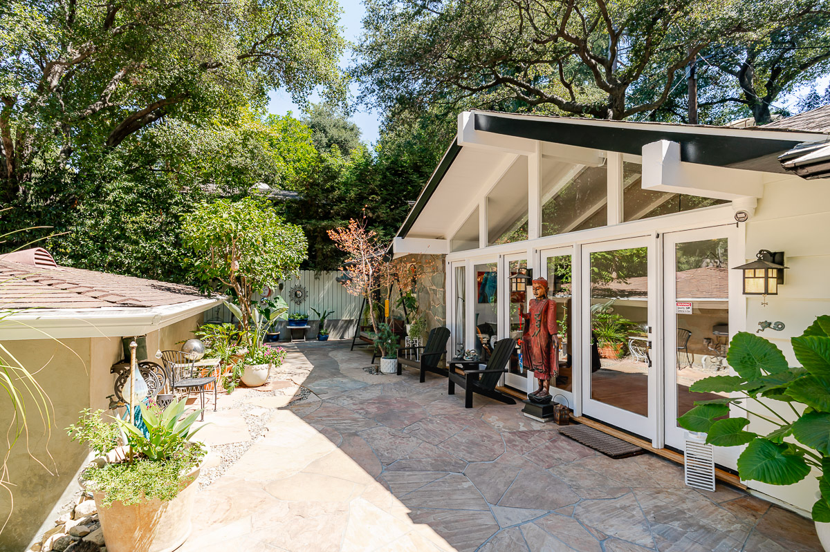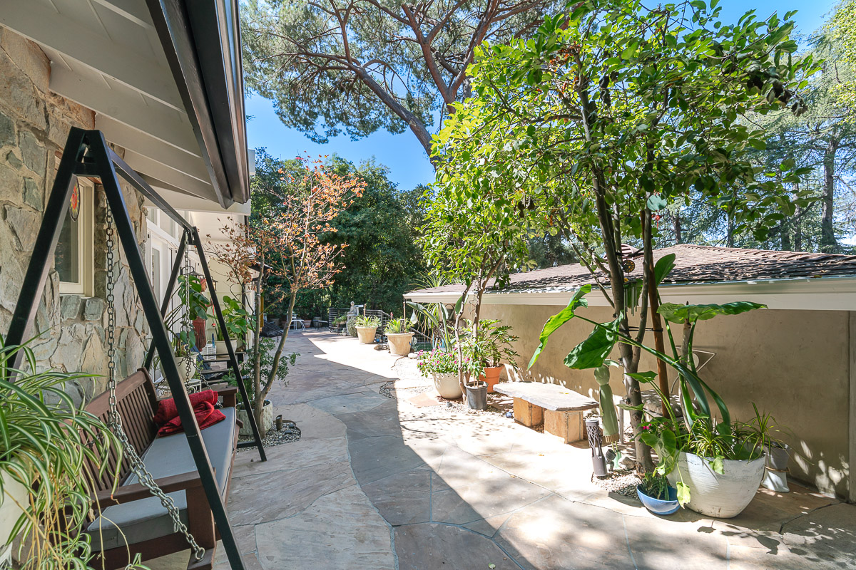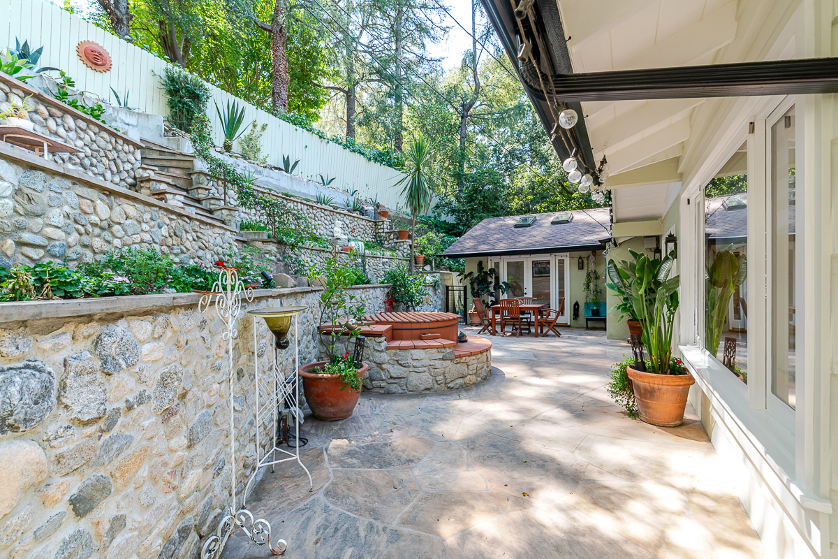 Welcome to 5220 Palm Drive, a beautiful Ranch-style home with Mid-Century influences, nestled in the serene hills above La Cañada Flintridge. Built in 1955, this thoughtfully designed residence offers 3 bedrooms, 2 bathrooms, and 1,656 square feet of light-filled living space on a private 8,361 square foot lot. A winding pathway leads to a spacious flagstone patio, ideal for alfresco dining and entertaining. Inside, the fabulous floor plan features vaulted ceilings, skylights, hardwood floors, and abundant storage throughout. The living room and primary suite both open through French doors to a tranquil rear patio with a built-in hot tub, creating a seamless indoor-outdoor flow. The primary suite is a true retreat, complete with a large walk-in closet, claw foot soaking tub, and oversized shower. The chef’s kitchen is equipped with custom Alder cabinets, stainless steel appliances, a double oven, double dishwasher, farm sink, and a large island with prep sink—perfect for everyday living and entertaining. Outdoors, the beautifully landscaped grounds showcase mature trees and vibrant plantings, including two lemon trees, a Fuji apple tree, a Key lime tree, and a pomegranate tree. This lush setting provides an inviting backdrop for gatherings or peaceful relaxation. Additional highlights include a detached garage, expansive patios, and a setting that offers both privacy and serenity—an ideal retreat in one of La Cañada’s most desirable neighborhoods.